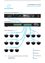 Este es el tipo de configuración que se usaría para un sistema subterráneo donde se requiere un potente servicio de enmascaramiento de sonido, por ejemplo, en edificios de gran altura. El distribuidor digital de Soundmask emparejado con el amplificador digital puede acoplarse con un solo generador para alimentar hasta 800 transductores con 8 zonas independientes.
